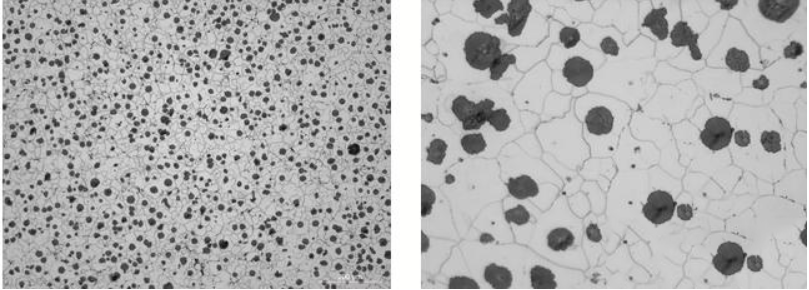 Dlatego, na podstawie obserwacji empirycznych, górną granicę równoważnika węgla w żeliwie sferoidalnym osiąga się, gdy w stopionym żelazie obserwuje się pływający grafit (w temperaturze około 1200°C). Wpływ zawartości węgla na właściwości użytkowe żeliwa sferoidalnego: Zawartość węgla w odlewach z żeliwa sferoidalnego wpływa na ilość grafitu wydzielonego podczas krzepnięcia, co odnosi się do średniej wielkości lub liczby kulek grafitowych. Zazwyczaj zawartość węgla wodlewy z żeliwa sferoidalnegowaha się od 2% do 3,9%, ale istotne jest zrozumienie wpływu zmniejszenia zawartości węgla na właściwości mechaniczne żeliwa. Należy to uwzględnić w oparciu o konstrukcję, wymiary, grubość ścianki i błędy w grubości ścianki sąsiednich płaskich ścianodlewy z żeliwa sferoidalnego. Zmniejszenie zawartości węgla w żeliwie sferoidalnym z około 4% do 2,5% może nieznacznie zwiększyć wytrzymałość na rozciąganie i granicę plastyczności (około 23 do 31 N/mm²), a także zwiększyć wydłużenie o około 5%, ze znaczną poprawą wartości udarności.